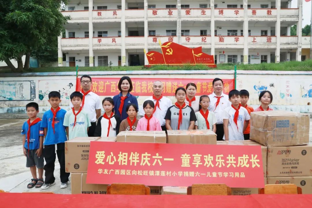 “不管在哪里投資,都要為當地經濟社會做貢獻”的投資理念,改善鄉村兒童學習生活環境,履行企業的社會責任,助力形成全社會關心和參與愛心助學的氛圍,5月29日上午,華友廣西園區到周邊的松旺鎮潭蓮村,雙旺鎮白平村、邦杰村、曾村和中心小學等5所小學走訪慰問,廣西區域管理中心及各產業集團廣西基地干部代表為5所小學3700多名學生送上書包、水杯、馬克筆和筆記本等學習用品作為兒童節禮物。
