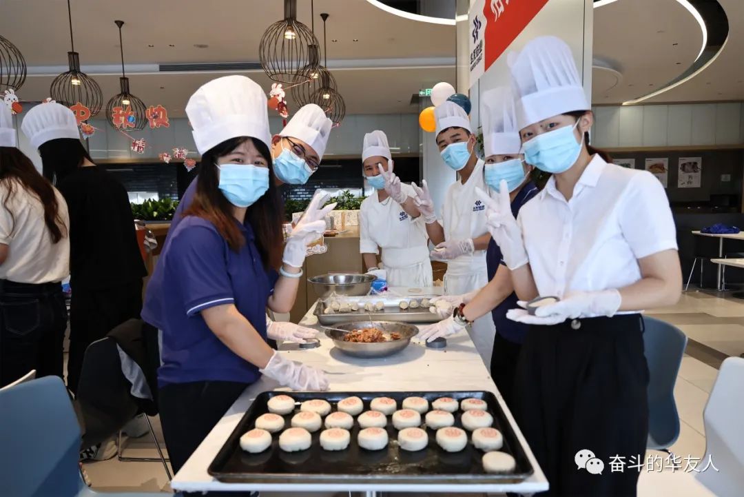 整裝完畢,在面點師傅的教學下,2023屆大學生們開始了手工月餅之旅。搓餡料、包餡、模具按壓……大學生們分工明確、有條不紊,興高采烈地交流制作方法,分享自己制作的獨特造型。在不斷的歡聲笑語中,一個個小巧精致的月餅新鮮出爐。