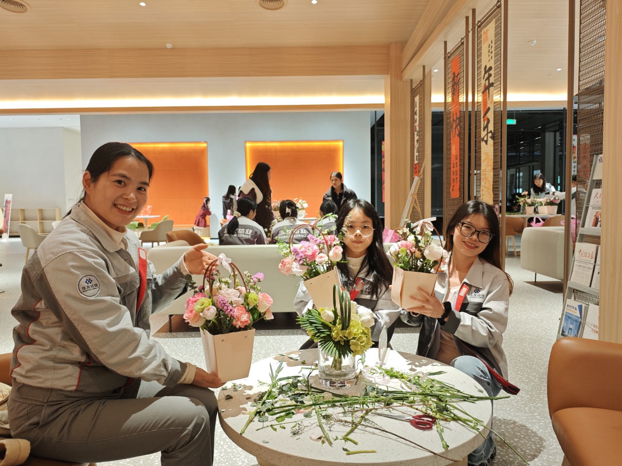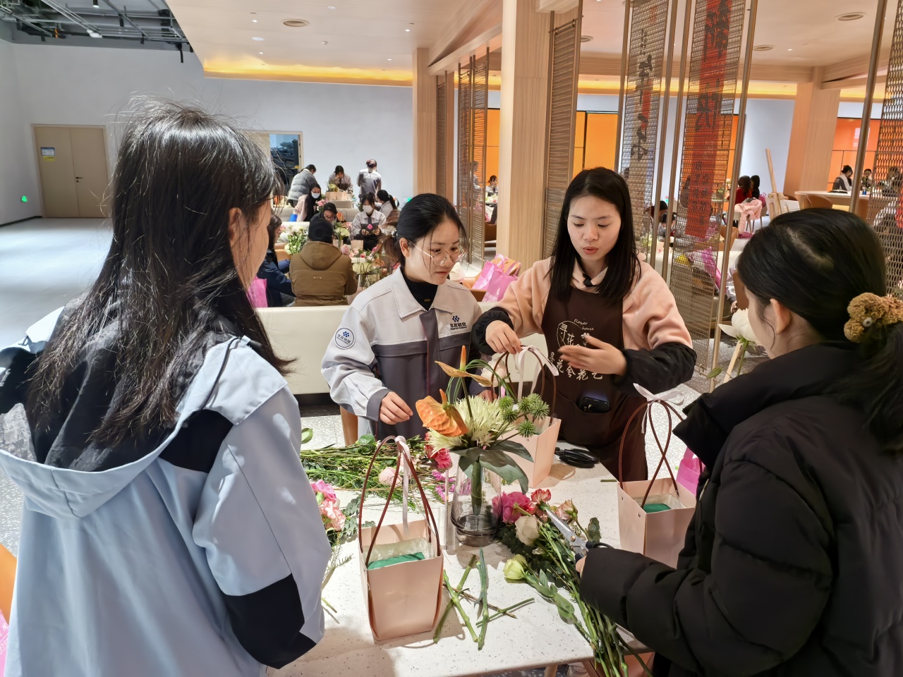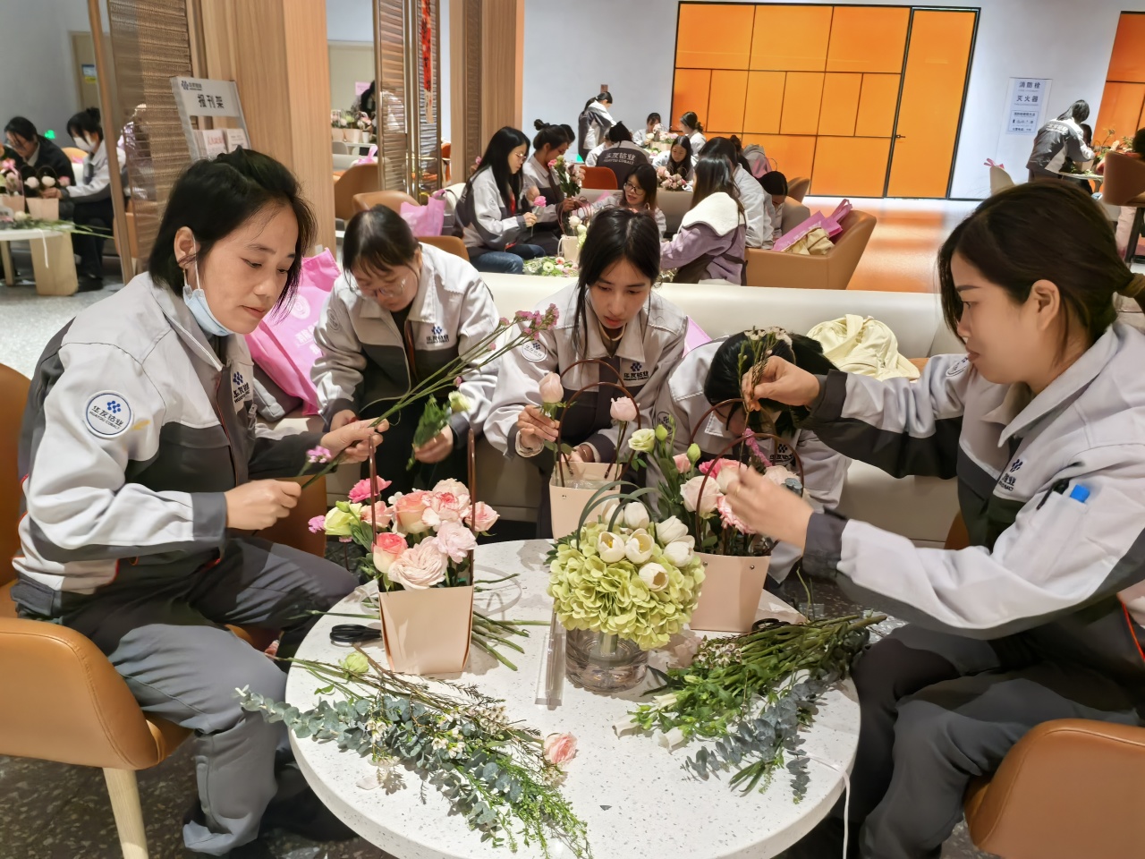 健康講座結(jié)束后,員工們?cè)诨ㄋ噹熤笇?dǎo)下進(jìn)行春日主題插花創(chuàng)作。拆開(kāi)春日花材包的那一刻,商超休閑中心化作花香彌漫的創(chuàng)作空間。康乃馨的溫柔、洋桔梗的靈動(dòng)、尤加利葉的堅(jiān)韌…… 每一束花籃都是職場(chǎng)女性多重角色的生動(dòng)寫(xiě)照。