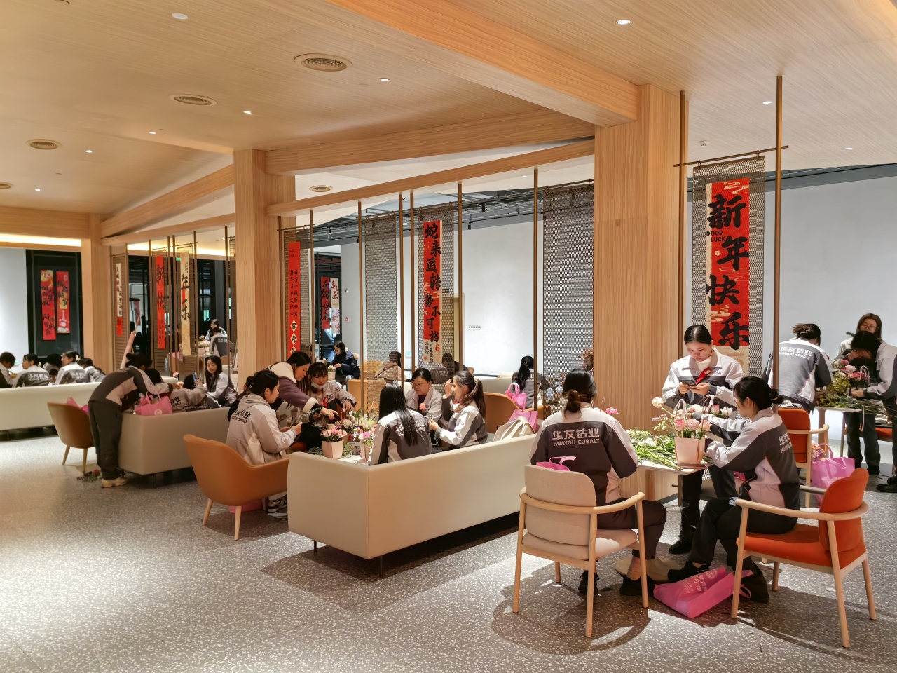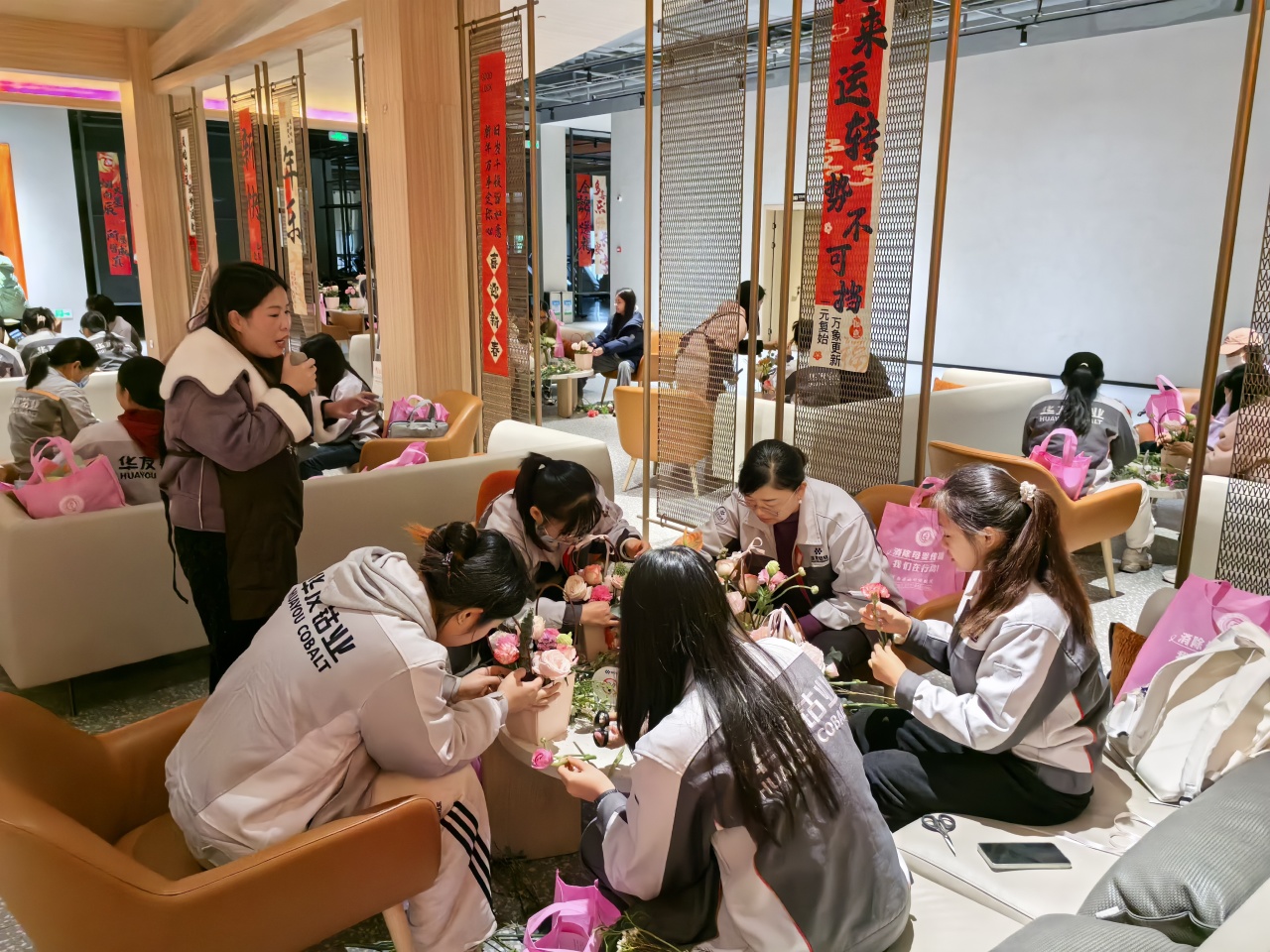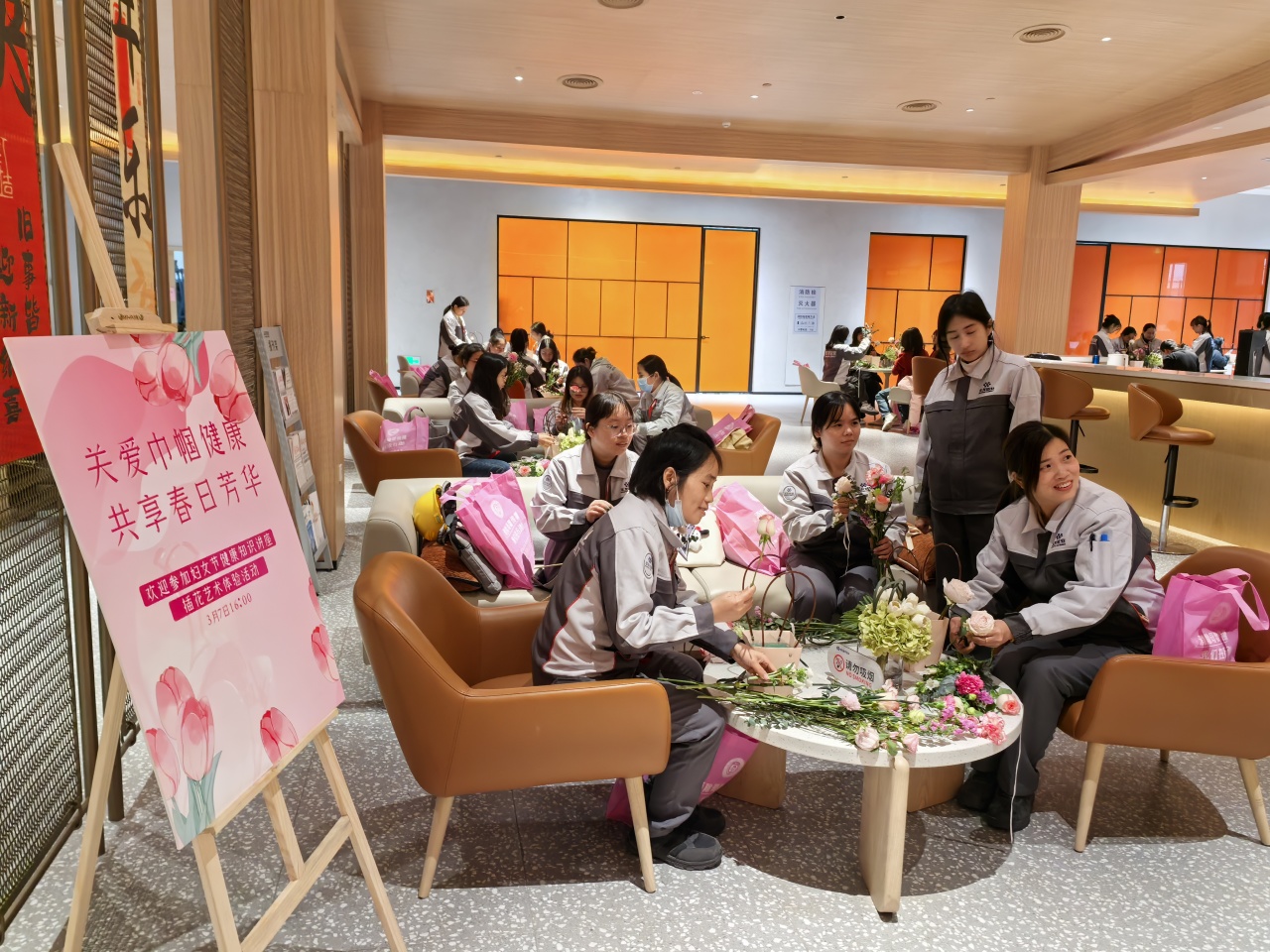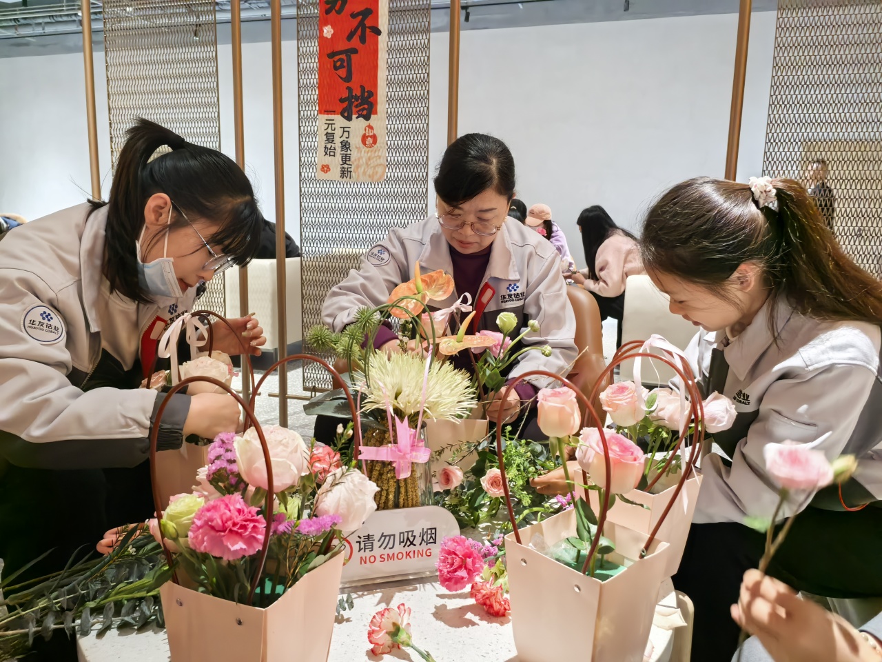 健康講座結(jié)束后,員工們?cè)诨ㄋ噹熤笇?dǎo)下進(jìn)行春日主題插花創(chuàng)作。拆開(kāi)春日花材包的那一刻,商超休閑中心化作花香彌漫的創(chuàng)作空間。康乃馨的溫柔、洋桔梗的靈動(dòng)、尤加利葉的堅(jiān)韌…… 每一束花籃都是職場(chǎng)女性多重角色的生動(dòng)寫(xiě)照。