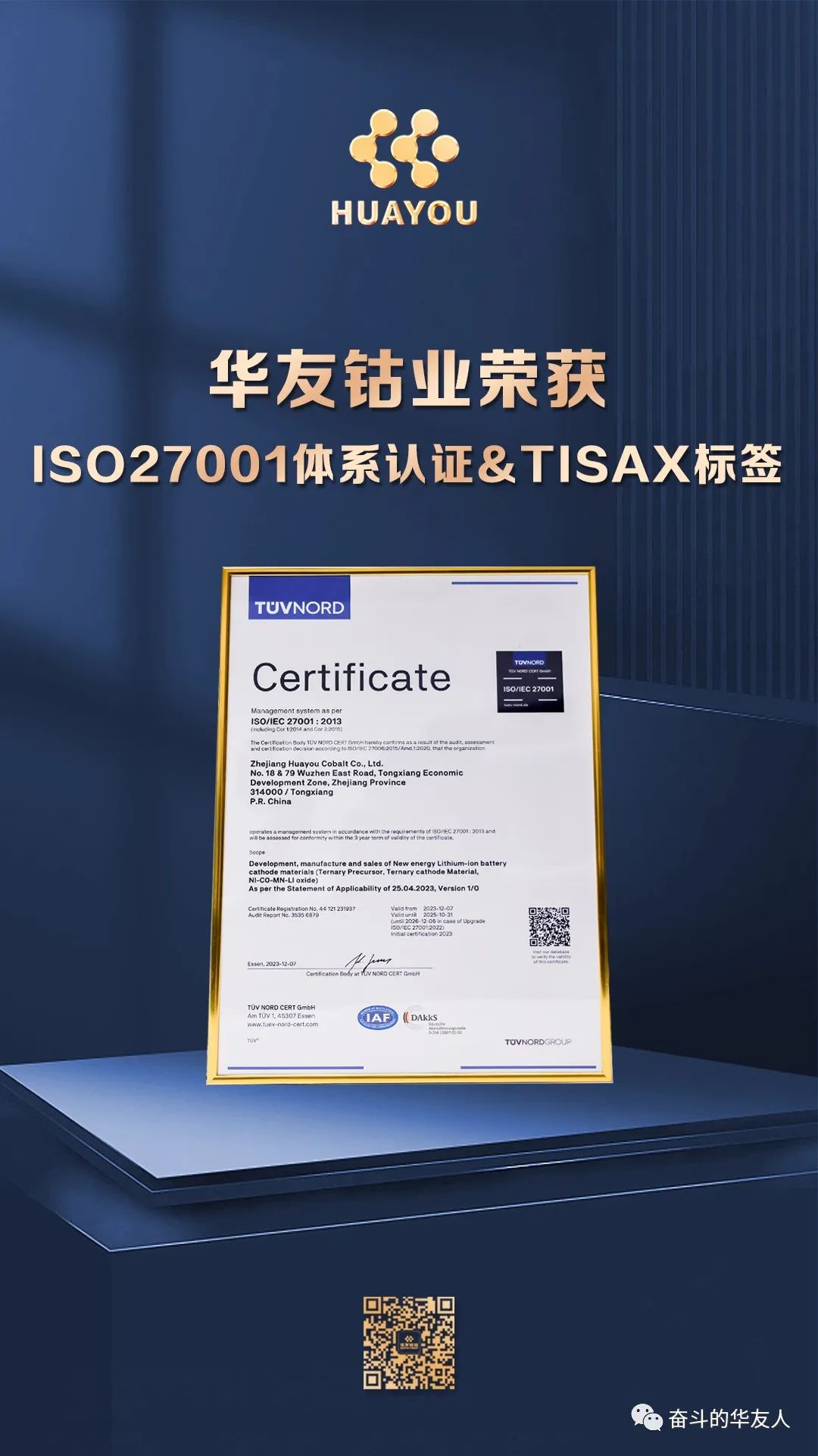 TISAX,由德國汽車工業協會推出,是信息安全領域的最高標準之一,主要用于評估和認證汽車供應鏈中的信息安全管理體系,以確保汽車行業的高安全標準,保護敏感信息和防止數據泄露。目前,TISAX認證在全球范圍的汽車主機廠商中備受推崇,供應商通過了該評估認證,即意味著得到了含汽車主機廠在內的所有參與方的認可。獲得TISAX標簽,意味著華友的信息安全體系得到了業界的廣泛認可,是進軍國際新能源汽車供應鏈的通行證。