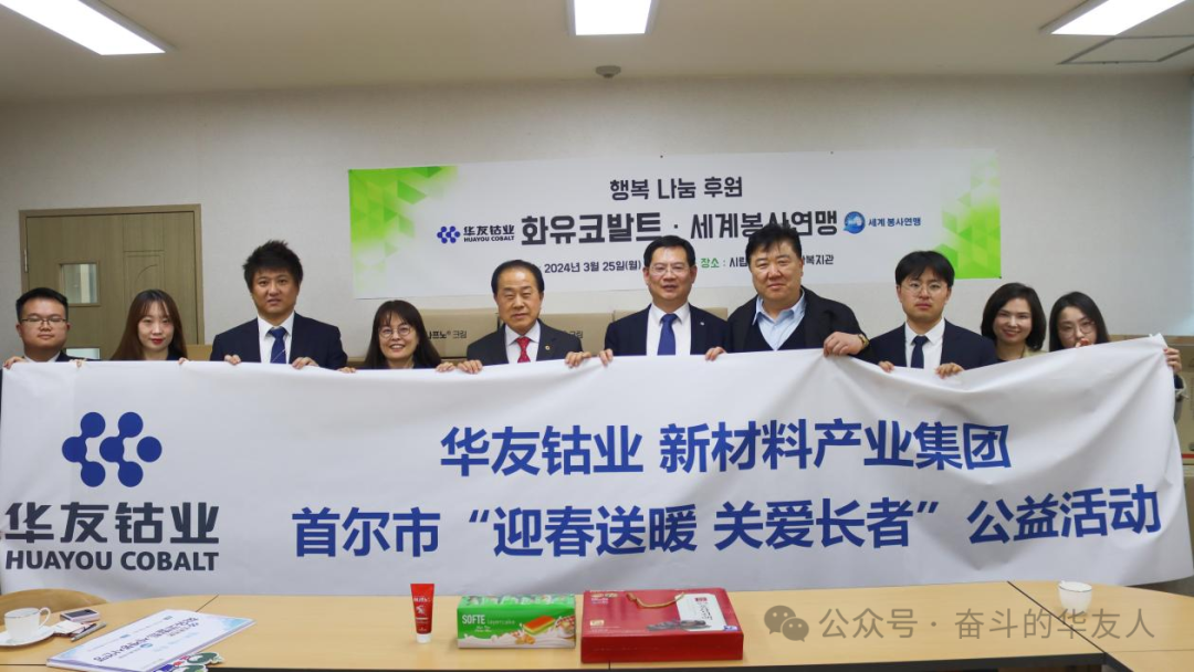 3月25日,華友鈷業(yè)新材料產(chǎn)業(yè)集團韓國代表處攜手首爾市議會金榮鎬議員、世界公益聯(lián)盟洪禎雨會長一同前往韓國首爾市立龍山老人綜合福祉館,共同開展“迎春送暖,關(guān)愛長者”公益活動,為長者們送去溫暖和關(guān)懷。