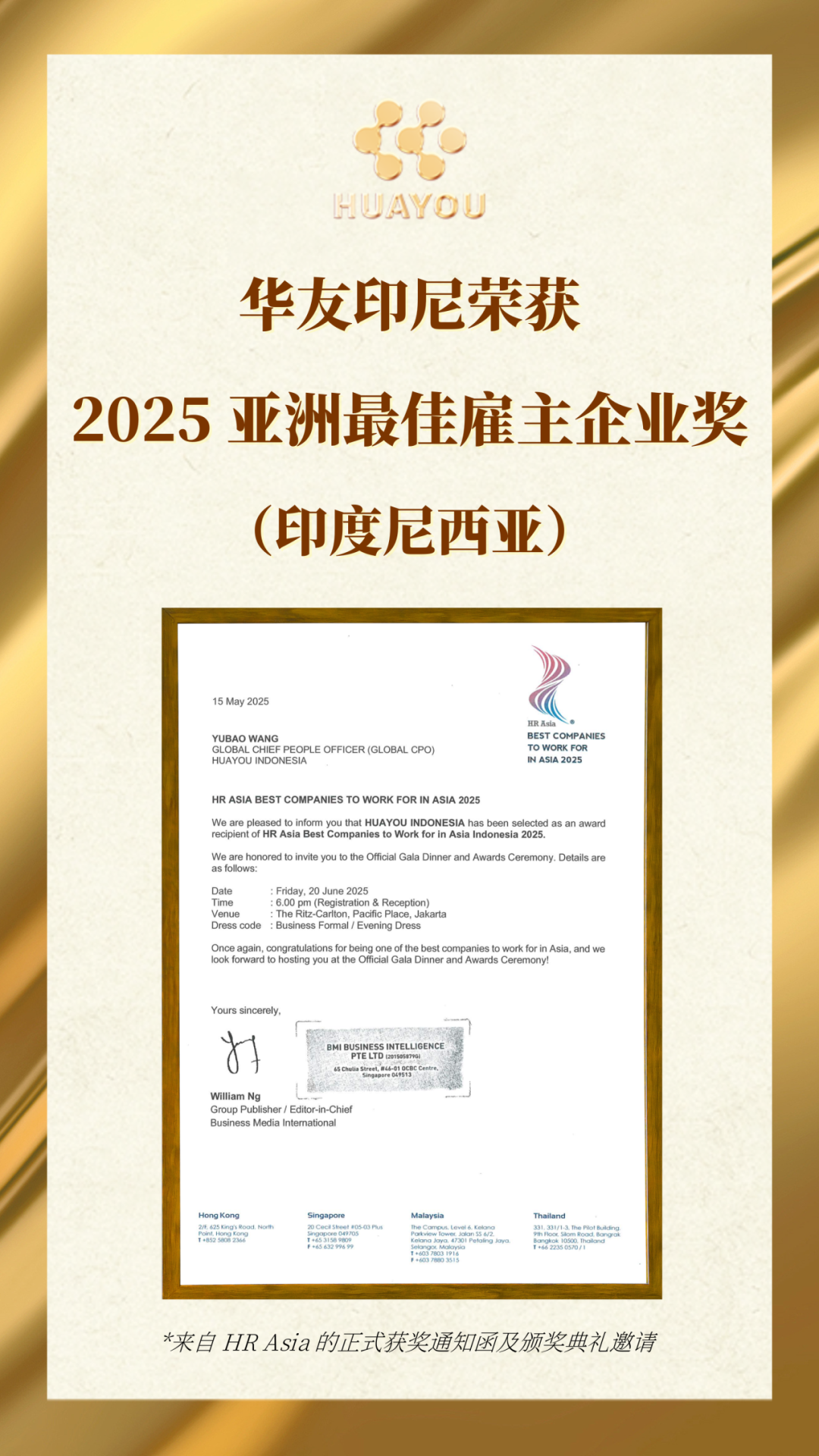 5月15日,亞太權(quán)威人力資源機構(gòu) HR Asia 公布“2025亞洲最佳雇主企業(yè)獎”(Best Companies to Work for in Asia)評選結(jié)果。華友首次參評即榮膺印尼地區(qū)最佳雇主企業(yè)品牌稱號,這是華友在印尼發(fā)展歷程中的重要里程碑,更是對公司長期踐行本地化人才戰(zhàn)略和履行企業(yè)社會責(zé)任的高度認可。