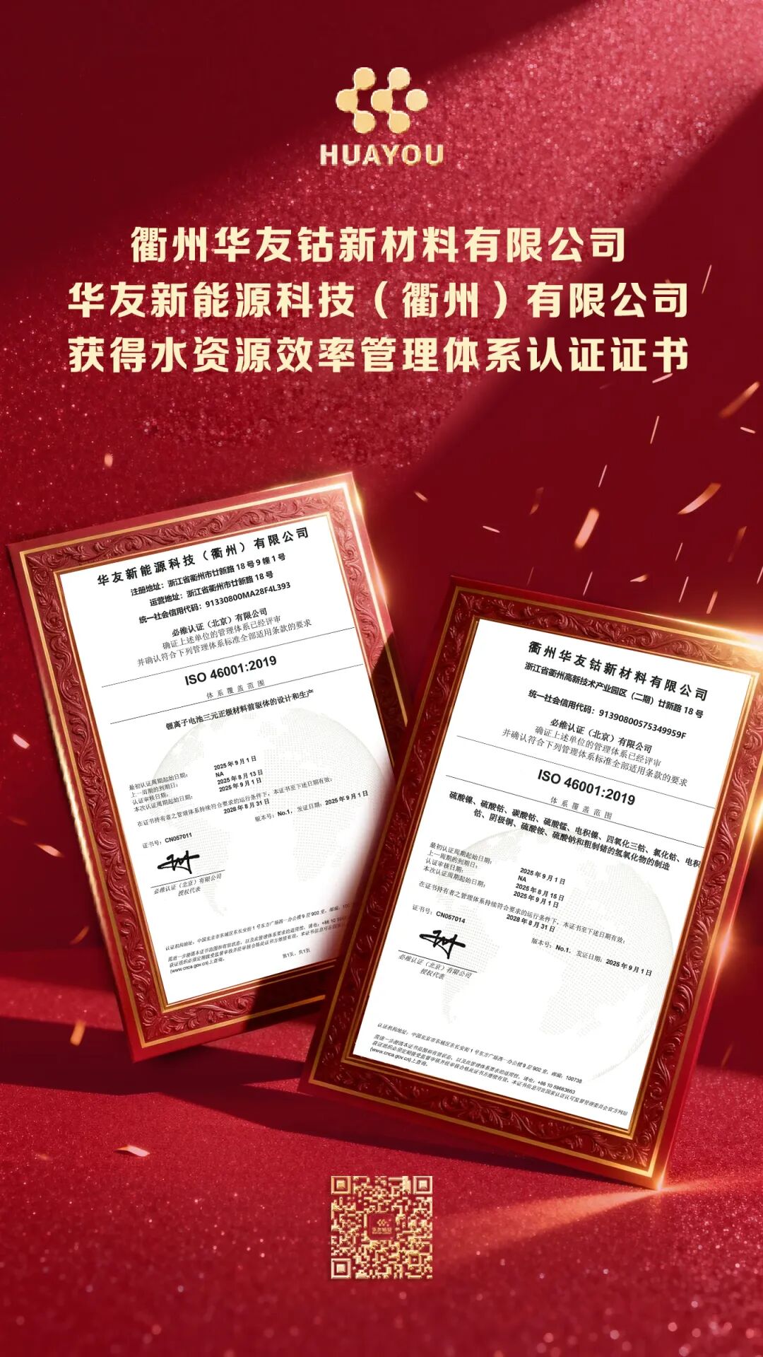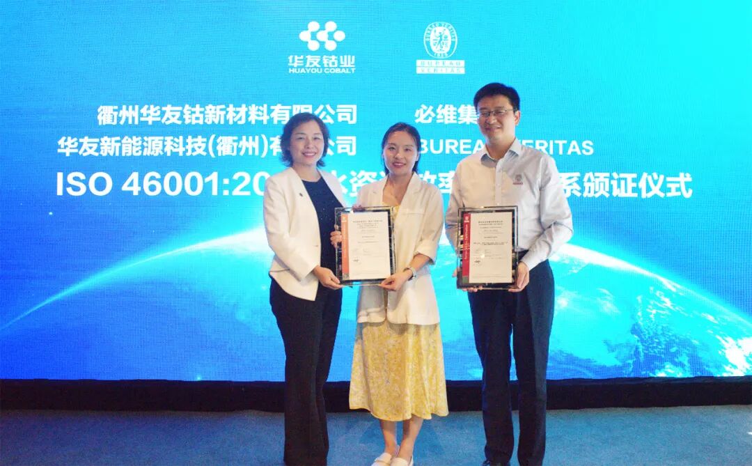 近日,在“從合規到卓越以環境為核心的可持續價值躍升之道”論壇上,華友鈷業旗下衢州華友鈷新材料有限公司和華友新能源科技(衢州)有限公司雙雙取得ISO46001水資源效率管理體系認證證書,成為新能源鋰電材料行業首家通過該國際認證的企業,彰顯了公司在綠色制造與可持續發展領域的領導地位,為鋰電新能源產業鏈樹立了水資源管理的新標桿。