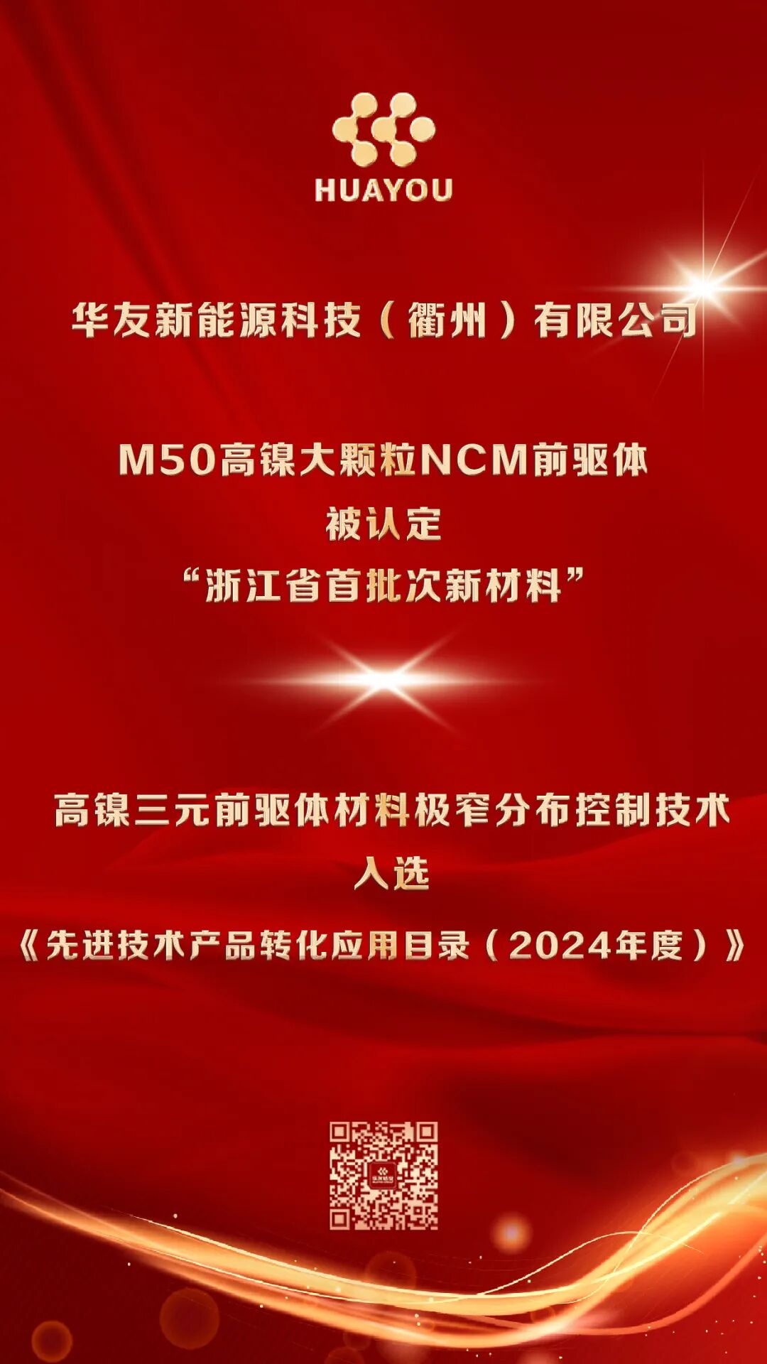 近日,浙江省經濟和信息化廳發布《2025年度浙江省首批次新材料認定名單》,華友新能源科技(衢州)有限公司自主研發的“M50高鎳大顆粒NCM前驅體”成功入選,被認定為“浙江省首批次新材料”,標志著公司在高鎳材料領域的創新能力獲得省級權威認可。