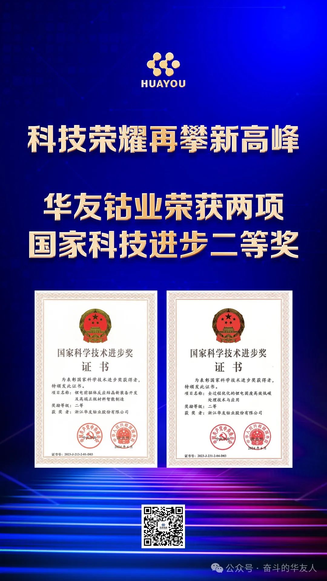 6月24日,2023年度國家科技獎勵獲獎情況揭曉,中國科學院過程工程研究所主導、華友參與的2項科研成果——“鋰電前驅體反應結晶新裝備開發及高端正極材料智能制造”、“全過程優化的鋰電固廢高效低碳處理技術與應用”榮獲2023年度國家科學技術進步二等獎,標志著華友在有色金屬綠色精煉、鋰電材料開發、資源循環再生利用領域創新成果再攀新高峰,彰顯了華友在新能源材料技術革新與可持續發展方面的領先地位。