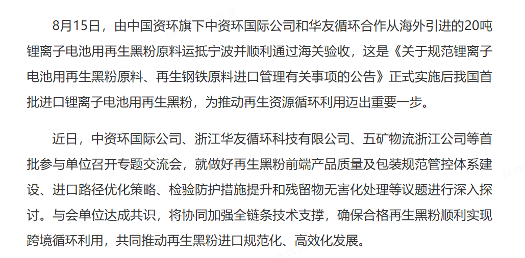 8月15日,由中國(guó)資環(huán)旗下中資環(huán)國(guó)際公司和華友循環(huán)合作從海外引進(jìn)的20噸鋰離子電池用再生黑粉原料運(yùn)抵寧波并順利通過(guò)海關(guān)驗(yàn)收,這是《關(guān)于規(guī)范鋰離子電池用再生黑粉原料、再生鋼鐵原料進(jìn)口管理有關(guān)事項(xiàng)的公告》正式實(shí)施后我國(guó)首批進(jìn)口鋰離子電池用再生黑粉,為推動(dòng)再生資源循環(huán)利用邁出重要一步。